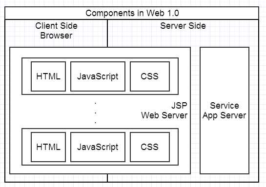 在这一时代,所谓的组件化,基本都是taglib这样的思路,把某一块界面包括它的业务逻辑一起打成一个端到端的组件,整个非常独立,直接一大块从界面到逻辑都有,而且逻辑基本上都是在服务端控制,大致结构如下图所示。