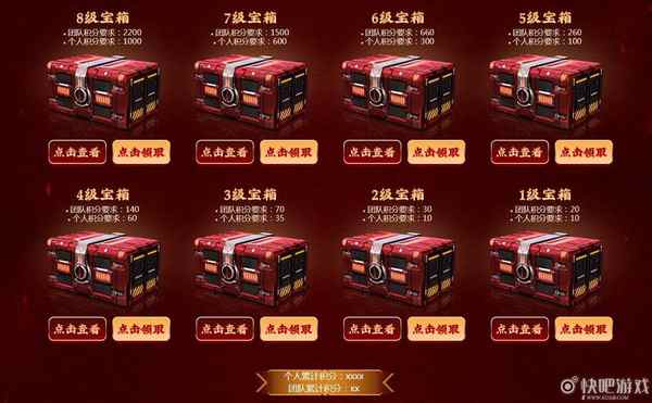 玩家还可以在活动页面中创建或加入团队,成团后团队和个人累计积分达到指定数字,即可领取对应宝箱。团队累计积分为团队内所有人的个人累计积分总和。