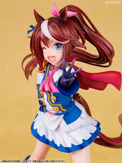 活泼开朗的赛马娘,东海帝王以游戏中的支援卡“梦想就是要展示的!”插画的华丽制服人设造型进行立体化。标志性的白色挑染发梢,搭配上栗色的单马尾。白色搭配蓝色的制服与短裙。肩膀上的金色装饰搭配金色袖口十分华丽。犹如比赛奖杯底座的手办底座也充满荣誉感。寿屋官方特典为表情替换件。寿屋官方特典为“表情替换件”。