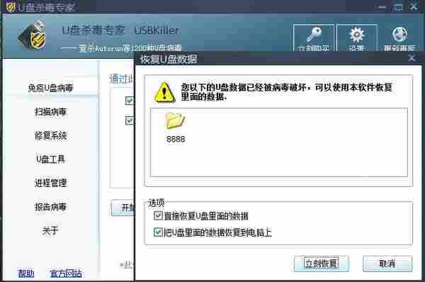 —自动恢复: 杀完病毒后能自动修复U盘隐藏文件,以及恢复系统设置;