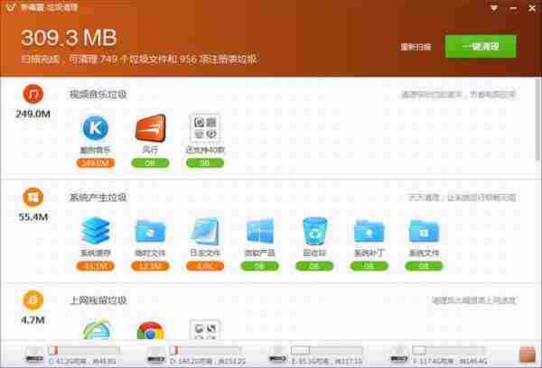 金山毒霸的垃圾清理工具,短小精悍,有着绚丽的界面,无论是启动画面还是扫描界面,设计得都是大气有档次,而且还有着和界面一样强大的功能,不失为国产清理软件中的精品,极炫垃圾清理,就要爽的感觉!